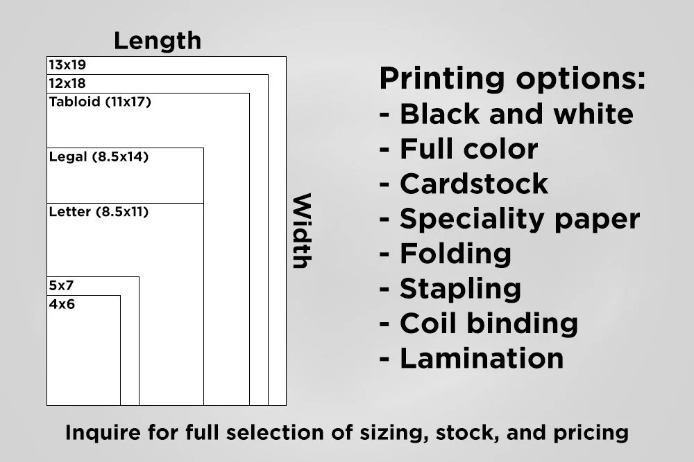 Printing (Letter, Legal, Tabloid, sizes up to 13” x 19”)